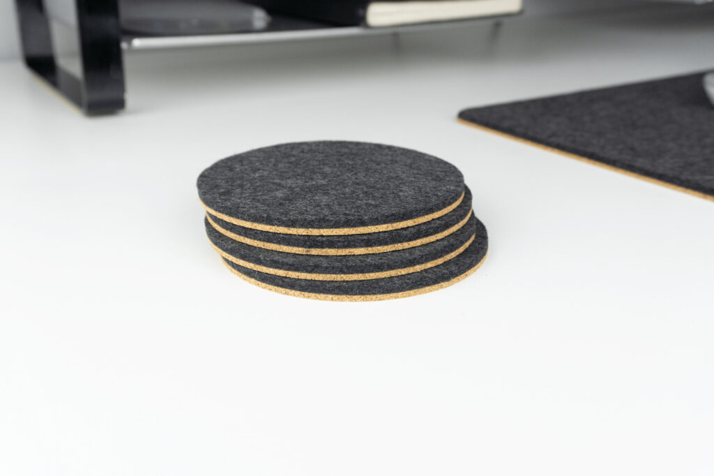 Our coasters use same merino wool and cork as our desk mats and they’re available in the same matching shades.